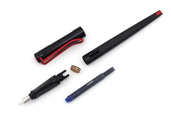 This pen is made of shiny black plastic, and features an ergonomic grip and flexible spring brass wire clip. A variety of ink cartridges or a Lamy converter can be used. Installing ink cartridges is easy—simply insert the cartridge into the pen nib section (no need to push completely), then twist the barrel onto the nib section. Attaching the barrel automatically punctures and installs the ink cartridge.